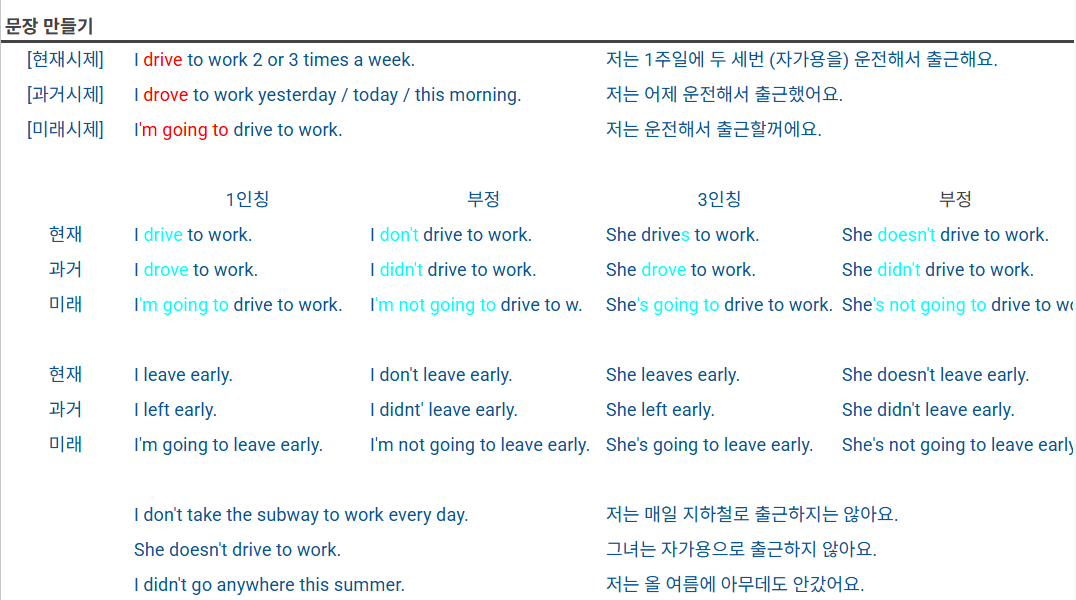 기초 문장 + 주어 변화 예시 + 시제 변화 예시 로 구성되어 있어